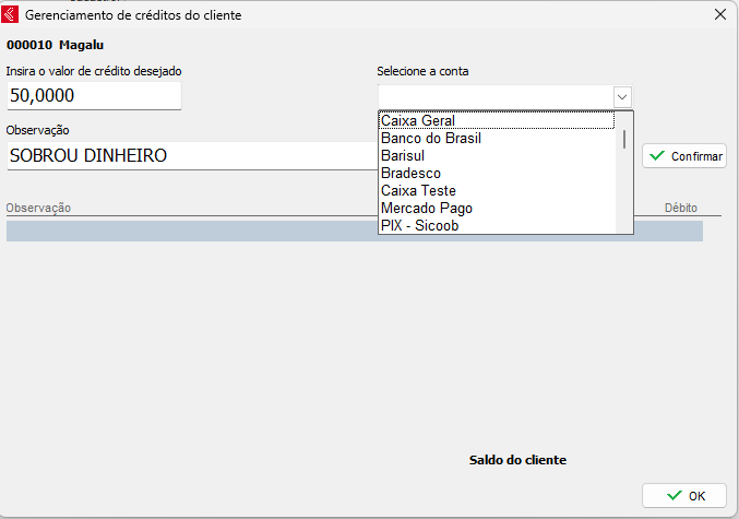 Agora, insira o crédito do cliente, selecione a conta que deseja, insira a observação do que se refere o crédito e clique em Confirmar.