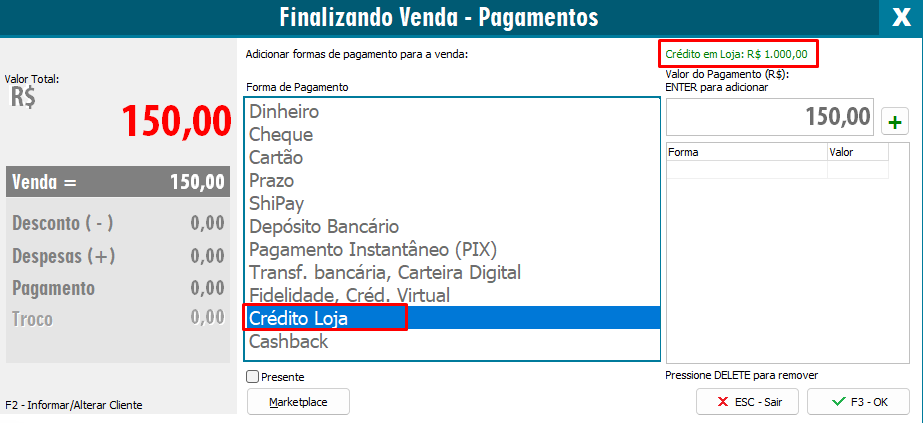 Na NFC-e, durante a finalização da venda basta escolher a opção Crédito Loja, caso queira conferir o valor de crédito que o cliente tem atualmente, será apresentado a cima do valor de pagamento.