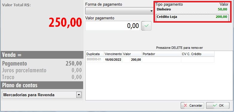Caso, por exemplo, o saldo disponível para o cliente for de R$200,00 mas a compra deu R$250,00 e ele quer pagar essa diferença no dinheiro, escolha o faturamento Múltiplas, lance o valor pago em dinheiro e o restante como Crédito Loja;