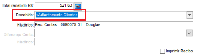Caso o cliente tenha um crédito disponível, será possível utiliza-lo para adiantamento de contas a receber, no recebimento da conta em questão, será possível determinar o tipo de recebimento como adiantamento Cliente, conforme imagem abaixo.