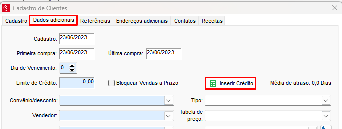 Primeiramente abra o cadastro do cliente que deseja adicionar o crédito, clique na aba dados adicionais e clique em Inserir Crédito;