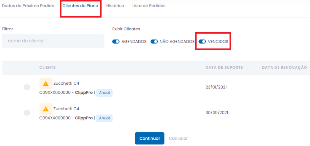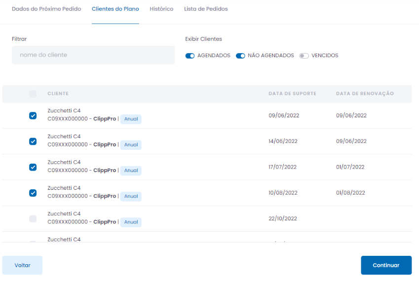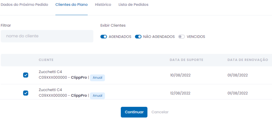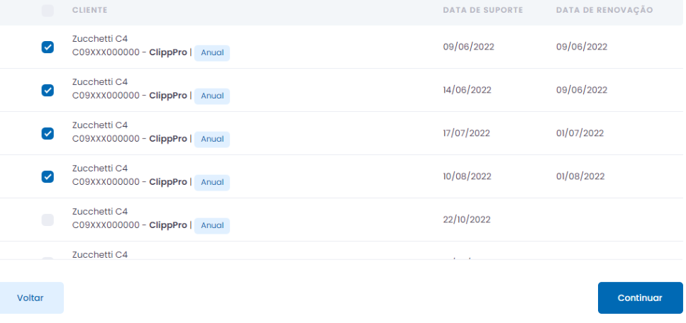 Todos os seriais virão desmarcados, basta selecionar quais deseja renovar neste momento. Marque os clientes e clique em Continuar.