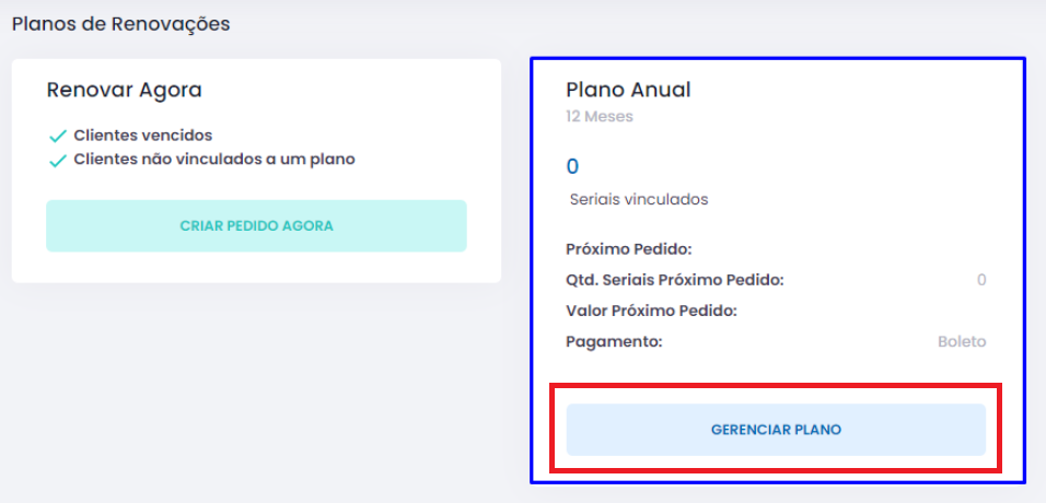 As renovações automáticas só poderão ser realizadas para clientes que tenham a data limite de suporte nos meses posteriores. Para programar ou então agendar uma renovação de um cliente que seja realizado de forma automática, no painel de renovações, no quadro Plano Anual, clique em Gerenciar Plano.