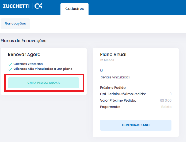 Para renovar seus clientes, após acessar o painel de renovações será apresentada a tela abaixo, o primeiro passo é clicar em Criar pedido agora, feito isso, na tela aberta, você será direcionado para selecionar os clientes que deseja renovar.