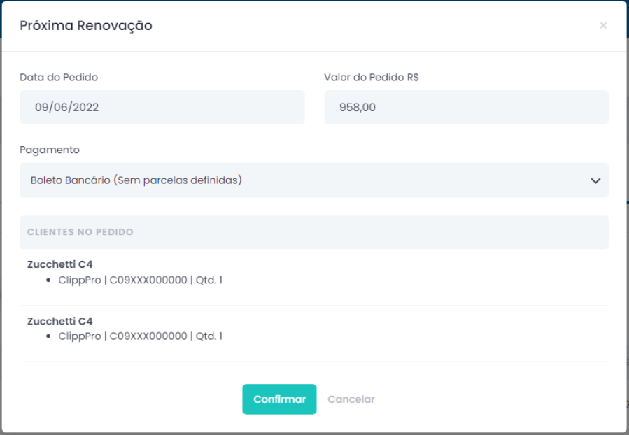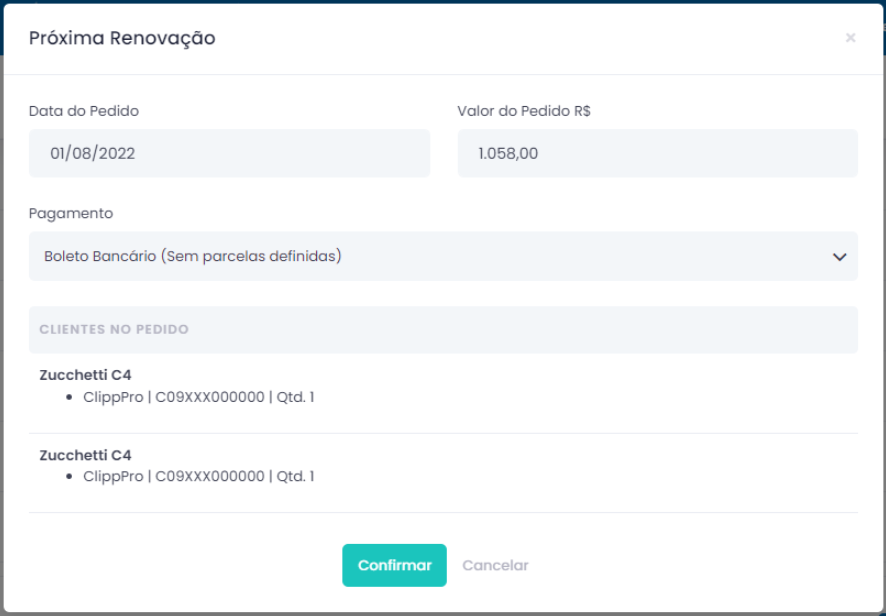 Ao clicar em Confirmar, se a Data do Pedido for igual a data atual que estiver realizando o processo, a renovação será feita, caso seja de um mês posterior, os clientes listados terão sua renovação programada e será executada de forma automática, na data apresentada.