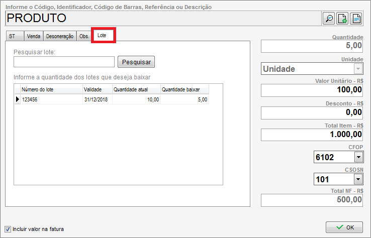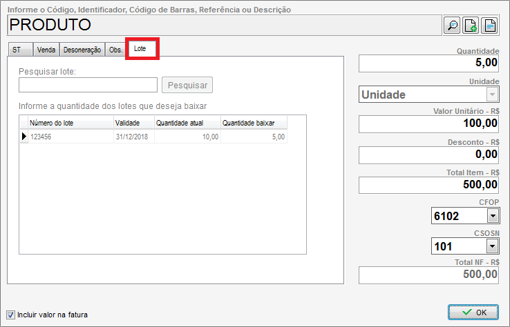 Impressão do Lote na Nota de Venda