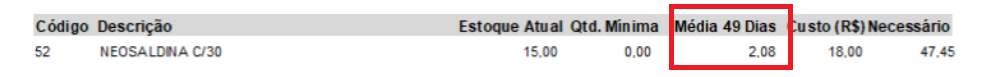 A coluna Média 49 Dias refere-se a média de vendas por dia nos 49 dias de intervalo entre as datas selecionadas, nesse caso foi de 102, então 102/49 = 2,08