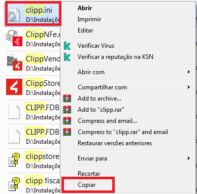 Em seguida, abra a pasta Clipp que for apresentada, a qual foi compartilhada automaticamente pela instalação feita no computador Servidor, localize o arquivo Clipp.ini (ou apenas Clipp), clique com o botão direito no mesmo e clique na opção Copiar;