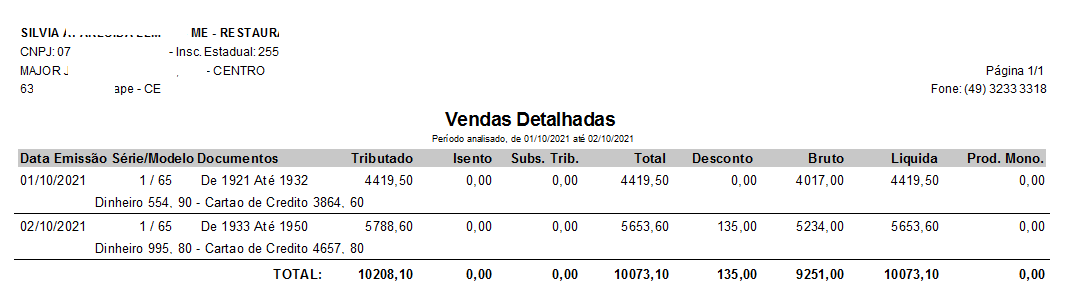 O relatório será demonstrado conforme exemplo abaixo, será exibida a data de emissão, série e modelo dos documentos emitidos no dia, total em dinheiro e cartão, total de tributação, vendas isentas, substituição tributária, total geral das vendas, descontos, valor bruto e líquido das vendas, além do total de produtos monofásicos.