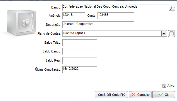 Na descrição preencha conforme achar conveniente, escolha o plano de contas Unicred (caso não tenha cadastrado, clique aqui para saber como cadastrar), os campos: Saldo Talão, Saldo Banco, Saldo Real e Última Conciliação serão preenchidos conforme ir movimentando valores no banco.