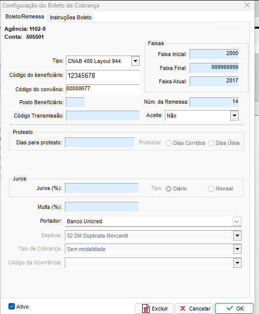Na tela de configuração do Boleto de Cobrança é necessário cadastrar: