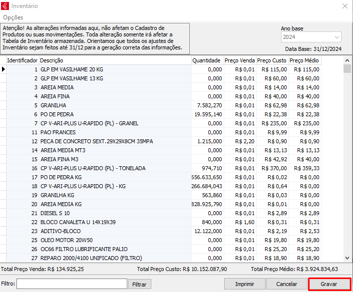 Com a tabela de inventário você poderá alterar as informações relativas ao inventário original. Recomendamos realizar as alterações com auxílio da contabilidade.