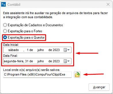Abra o arquivo Contabil.exe que baixamos anteriormente, marque a opção Exportação para o Questor, selecione a data desejada e o caminho aonde será salvo o arquivo;