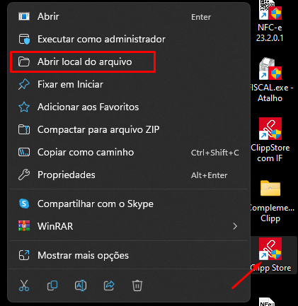 Após baixar o arquivo, copie ele e cole na pasta Exe do sistema, para acessar ela, siga o caminho padrão C:\Program Files (x86)\CompuFour\Clipp\Exe - ou clique com o botão direito do mouse no atalho do sistema na área de trabalho, e vá até Abrir Local do Arquivo;