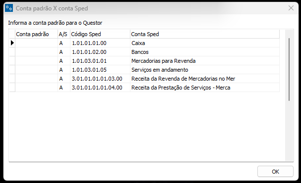 Na próxima tela, verifique com a contabilidade qual a conta padrão para o Questor, e clique em OK;