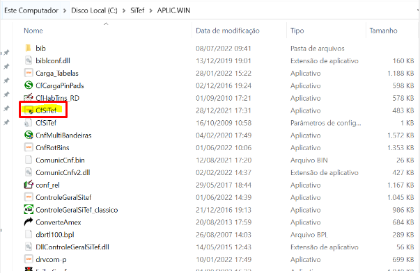 Para encontrar o aplicativo CfSitef, vá até o Disco Loca (C):\SiTef\APLIC.WIN;