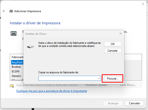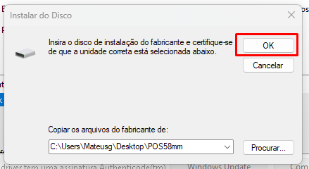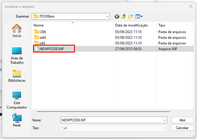 Procure o local que você extraiu o Driver anteriormente, e selecione o arquivo NEWPOS58.INF e clique em abrir