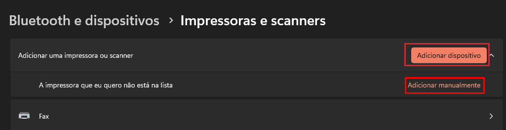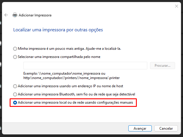 Após clicar em Adicionar manualmente, selecione a opção Adicionar uma impressora local ou de rede usnado configurações manuais e clique em Avançar.