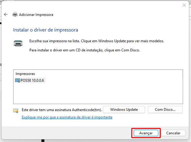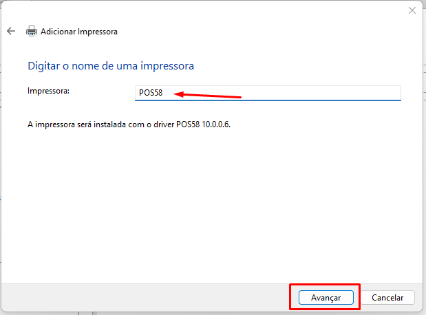 Coloque um nome mais simples para a impressora, como por exemplo POS58 e clique em Avançar
