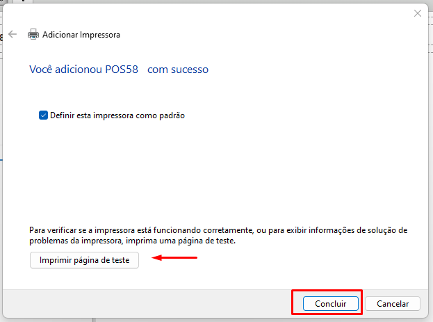 Clicando em avançar novamente, vai apresentar a tela abaixo, clique em Imprimir Página de Teste, quando imprimir na impressora 58mm, pode clicar em Concluir