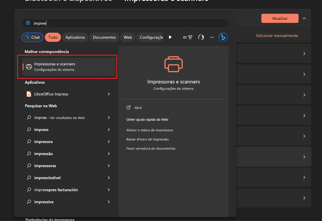 Após extrair os arquivos, vá até o Menu Iniciar do Windows - pesquise por Impressoras e Scanners
