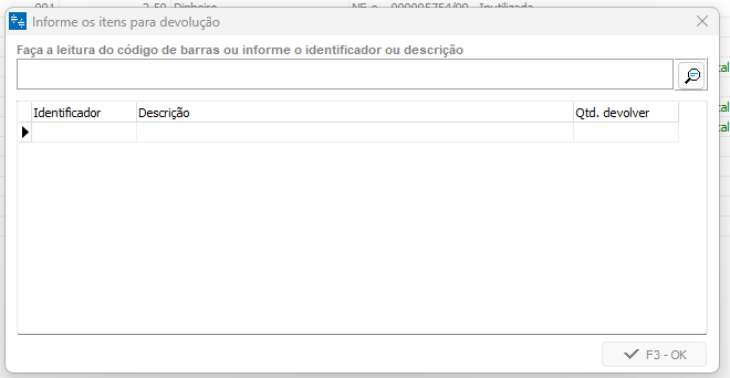 Informe o produto, ou pressione a tecla Enter e serão listados todos os itens da venda, selecione o produto que deseja devolver, no campo de Qtd. devolver informe a quantidade que está devolvendo e pressione o botão F3 - OK.