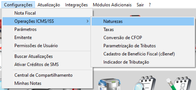 Em seguida, acesse Configurações - Operações ICMS/ISS - Naturezas e clique duas vezes na natureza (CFOP) que você irá utilizar na nota fiscal, indique a mesma tributação;