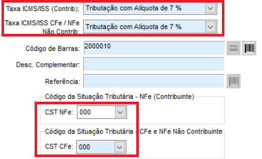 Primeiramente é necessário indicar no item algumas tributações, por exemplo o CST e a taxa ICMS/ISS, que é a alíquota correspondente ao cálculo. Abaixo são apenas exemplos, lembre-se de verificar com sua contabilidade os valores correspondentes;