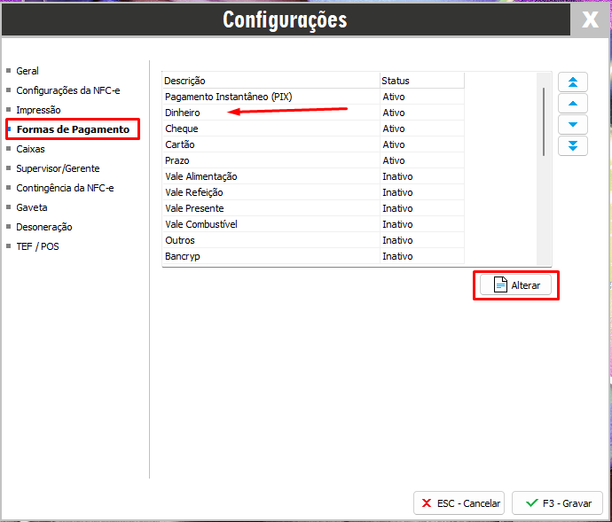 Acesse a aba Forma de Pagamento, selecione a forma de pagamento que deseja vincular uma telca de atalho e clique em Alterar.