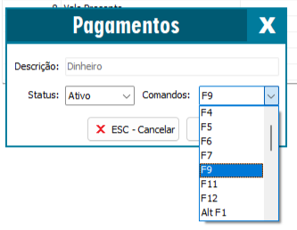 Na janela da forma de pagamento estará presente o campo de Comandos, selecione a telca de atalho que deseja.