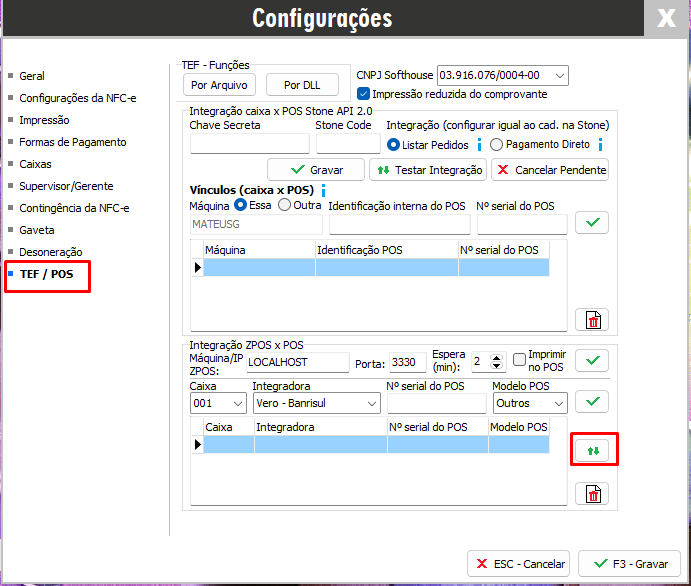 Acesse o menu F10 - Configurações vá até TEF / POS e clique no botão à direita destacado para atualizar o aplicativo ZPOS.exe