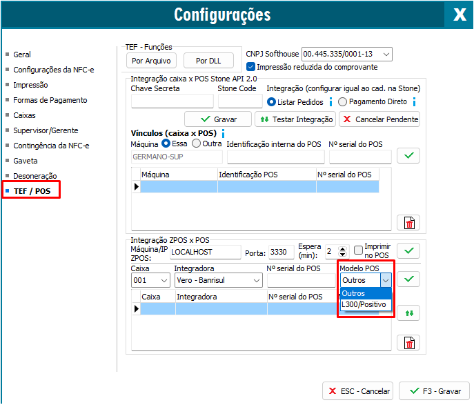 Para encontrar essa opção, vá até o seu Emissor de NFCe - Pressione F10 Configurações - TEF/POS