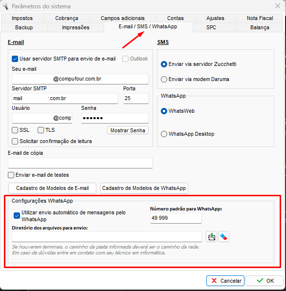 Para realizar a configuração vá até Configurações - Parâmetros - encontre a aba E-mail / SMS / Whatsapp - No final dessa tela, você irá encontrar a opção Utilizar envio automático de mensagens pelo WhastApp