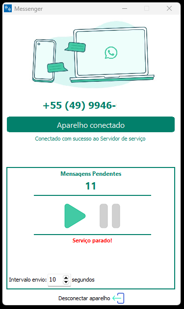 Abaixo serão apresentadas as mensagens pendentes e as opções de iniciar ou parar o serviço de envio.
