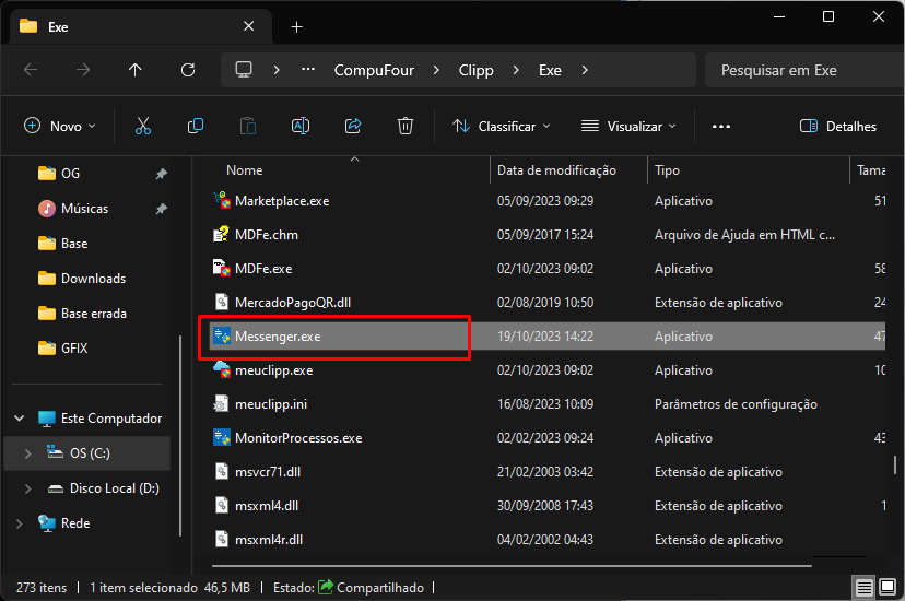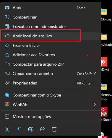 Para iniciar a configuração, acesse a pasta de instalação da solução para acessar a pasta, vá até o ícone do ClippStore, clique com o botão direito do mouse e vá até Abrir local do arquivo e localize o aplicativo Messenger.exe.