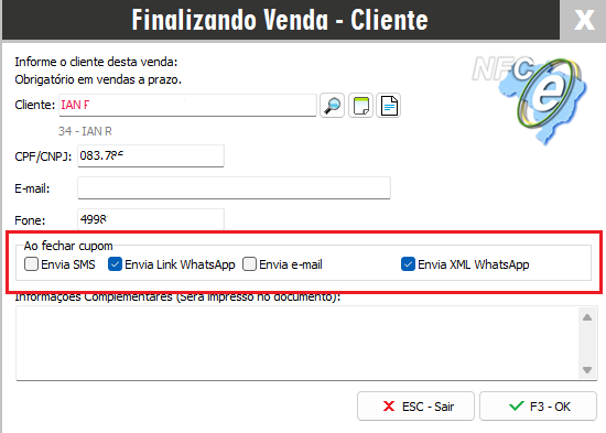 Lembrando que para emissão de NFC-e deve ter o cliente informado com o número do WhatsApp cadastrado.