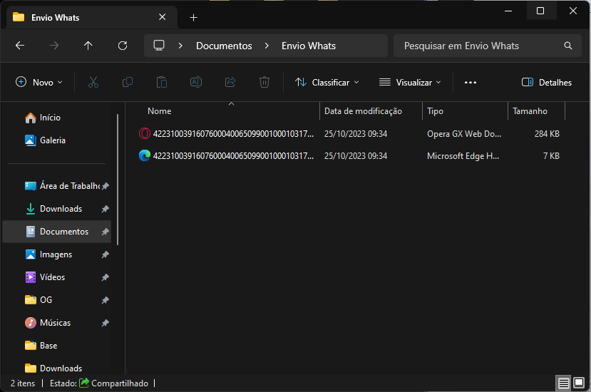 Na pasta criada, ao enviar a nota pelo WhatsApp, será criado o arquivo PDF e XML.