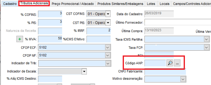 Caso tenha que usar os CSTs 02, 15, 53 ou 61, deverá clicar na aba Tributos Adicionais e preencher um código ANP diferente, que seja compatível com os CSTs de tributação monofásica citados anteriormente (deverá verificar com a sua contabilidade);