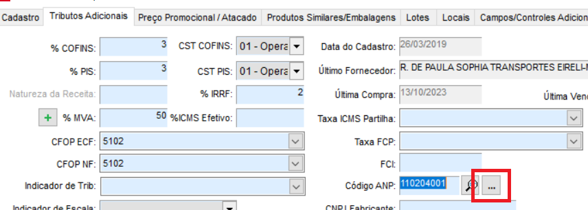 Clique na aba Tributos Adicionais, em seguida clique nos 3 pontos ao lado do código ANP;