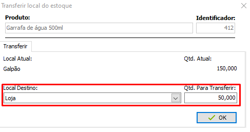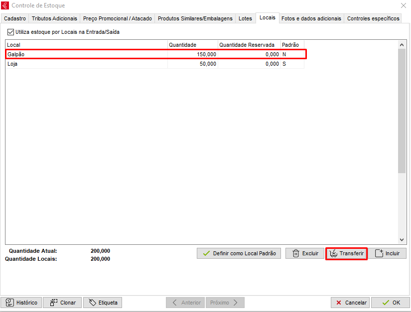 Ainda é possível transferir a mercadoria de um local para outro, para isso, clique sobre a mercadoria que deseja transferir e clique no botão Transferir;