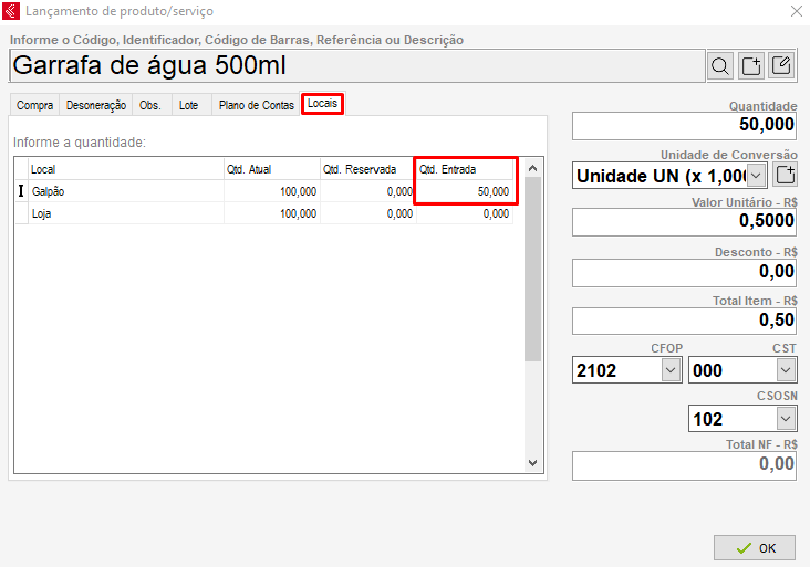 Na nota de compra basta adicionar o item juntamente com a quantidade que deseja alimentar no local em questão;