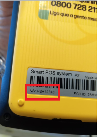 O número de série da sua maquininha pode ser visualizado em uma etiqueta em sua maquininha, abaixo segue um exemplo do número de série e sua localização: