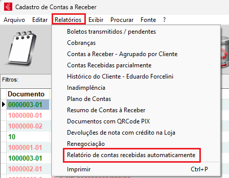 Para conferir os recebimentos feitos de forma automática, ainda no módulo de Contas a receber no menu de Relatórios, a opção de Relatório de contas recebidas automaticamente