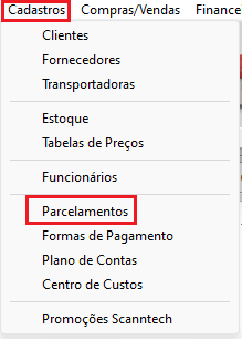 Com o ClippPro aberto, vá até o menu Cadastros e escolha a opção Parcelamentos