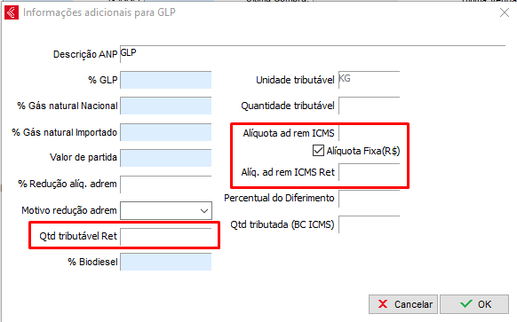 Efetue o preenchimento correto da Qtd tributável ret, alíquota ad rem ICMS, Alíq. ad rem ICMS Ret e Habilite a opção de Alíquota Fixa (R$). Verifique esses valores com sua contabilidade, se a mesma não souber, procure diretamente a SEFAZ.