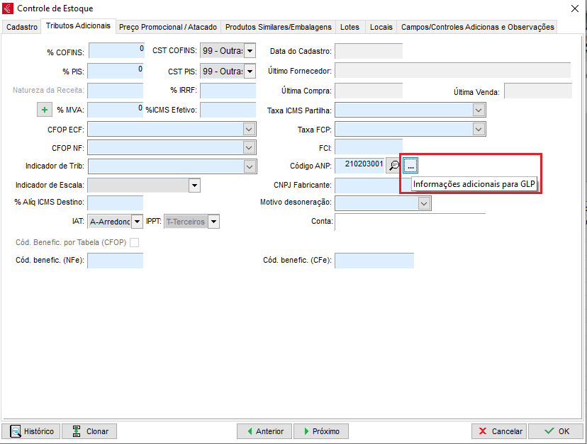Clique na aba Tributos Adicionais, em seguida clique nos 3 pontos ao lado do código ANP;