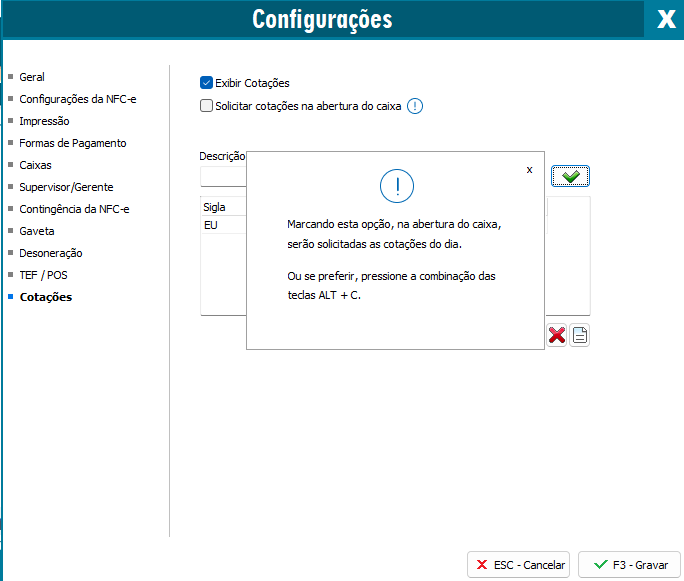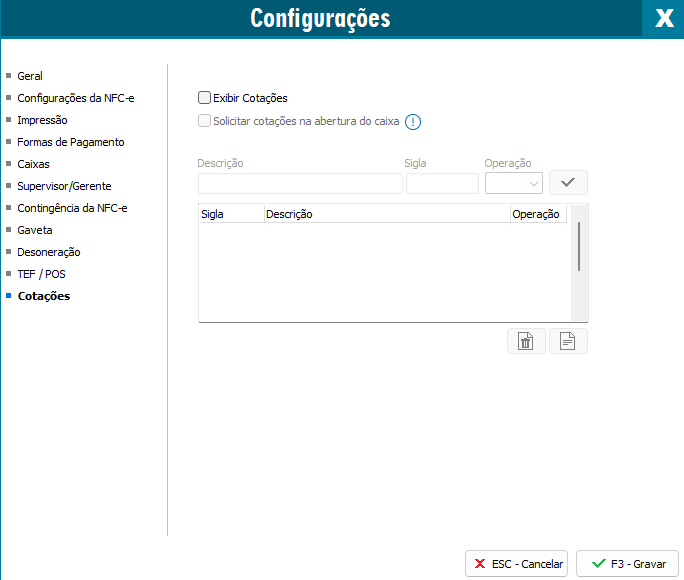 Primeiramente é necessário ativar a opção para ativar a cotação, para isso é necessário acessar Configurações (F10) - Cotações.
