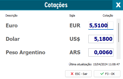 Ao abrir o caixa, caso foi marcado a opção Solicitar cotações na abertura do caixa. Será apresentado uma nova janela com as moedas cadastradas e o valor da cotação para ser preenchido de cada uma, caso não foi apresentado pressione a combinação das teclas ALT+C, Informe os valores e clique no F3 - OK.