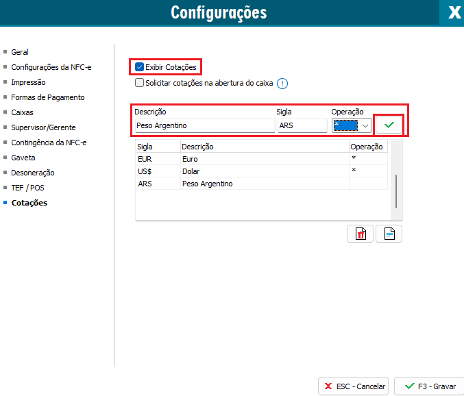 Após isso marque a opção Exibir cotações para poder então adicionar as moedas na qual será visualizado ao finalizar a venda, informado sua descrição e uma sigla.