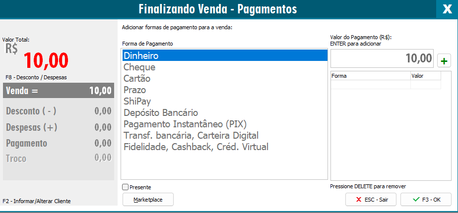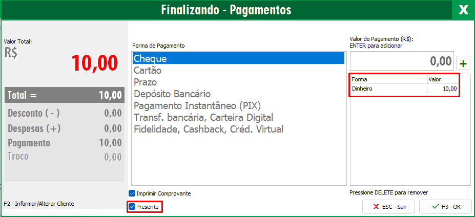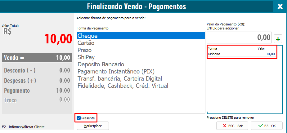 Nesta aba será necessário informar como o cliente irá pagar o valor total e após isso marcar a opção Presente.